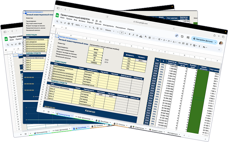 Таблица считает разные сценарии роста капитала. Вы видите, как будут увеличиваться ваши сбережения в зависимости от суммы вложений, сроков и выбранной стратегии. Это даёт понимание горизонта и ускоряет движение к цели.